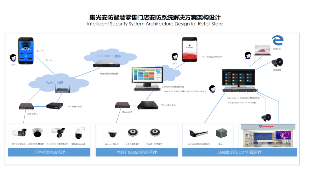 304.cam永利安防双光智能警戒系统 支持门店部署,摄像机部署于门店出入口, 除可满足门店视频监控功能外,当顾客进店时,该系统可第一时间通过前沿人形检测视频分析技术识别顾客进店状态,按后台预设欢迎语播报欢迎语音进行提醒,便于店员及时提供接待服务,提升门店新老顾客进店的体验及满意度,系统支持304.cam永利安防G-Cloud集云移动客户端远程视频管理、报警邮件推送。